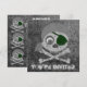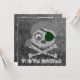 Cartões de convite de dois lados. O Front tem o personalizável "Você é Convidado". Voltar tem com informações de convite — introduza o seu título, data, hora, localização e informações adicionais ou mensagem pessoal. Crânio de Cinza e ossos cruzados com olho verde escuro e bandana de cinza. Olho no soquete esquerdo. Design está aflita.