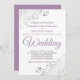 Este convite para o casamento apresenta uma design simples, mas elegante, com lavanda roxo e letra de cinza em um fundo branco. A simplicidade do design é compensada pelas bobinas de folha fina prateada nos cantos. O rico é ornamentado e floral e fornece um bom contraste com o texto subestimado. A formulação é formal e tradicional, mas a apresentação gráfica torna-a moderna e acessível.