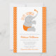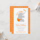 Um convite alaranjado e cinzento moderno do chá de fraldas do elefante. O teste padrão de bolinhas cor-de-rosa e branco doce limita as bordas. Um elefante bonito do bebê que veste uma fralda alaranjada com corações minúsculos. Aperfeiçoe para um partido de chá de fraldas do menino.
