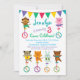 Um convite de aniversário de crianças caprichoso com animais bonitinhos andando monociclos incluindo um urso, macaco, porco, gato, cão e coelho. Apresenta cores vibrantes brilhantes de diversão azul, turquesa, vermelha, aqua, amarela e roxa do carnaval. Este convite para animais bonitos é perfeito para o garoto e a menina no primeiro aniversário, 1rua no segundo 3 no 4º 6 aniversários. Quer caçando bicicleta ou monociclo convida, este adorável convite de aniversário trará um sorriso.