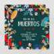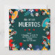 O convite mostra personagens esqueletos dispostos em círculo. Inclui homens, mulheres, gatos, cães, animais, flores, corações e até trompetes. Design de Natal bonito, colorido, festivo e hispânico. Personalize os detalhes da parte na frente. A design verde se repete atrás. Celebrar as vidas de pessoas amadas que morreram, no Dia de los Muertos, ou Dia dos Mortos, em outubro / novembro, perto do Halloween. Parte de um pacote de convites e suprimentos de festas.
