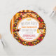 Um convite em círculo com um design de circo retrógrado giro e colorido apresenta cores brilhantes de vermelho, ouro, laranja, branco e marrom com pontos e listras, um elefante, palhaço, leão e áreas que você pode personalizar facilmente com seus detalhes de festa de aniversário!