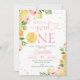 Citrino Floral Rosa Ela é uma doce convidadora de primeiro aniversario Floral e cítrica, o primeiro convite de aniversário de algumas limões, laranja, flores e folhagem, e uma caligrafia moderna que se dirige com um coração.