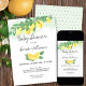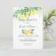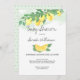Convite para chás de fraldas de citrinos com limões frescos e paleta de cor neutra em termos de gênero. O design tem um ramo de limões maduros e verde em aquarela, cunhas de limão e um mosto verde de hortelã. O convite é escrito com tipografia casual de estilo manuscrito e o modelo é configurado para você personalizar rapidamente os detalhes.