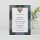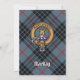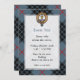 Crachá da crista Clan MacKay rodeado por uma correia e fivela sobre fundo azul-tartano. Texto personalizado de ambos os lados.