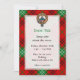 Crachá da crista Clan Morrison rodeado por uma correia e fivela sobre fundo vermelho-tartan. Texto personalizado de ambos os lados.