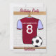 Jérsei de futebol do Claret com a bola de futebol que pendura em uma sala de mudança inteiramente customizável com seus próprios nome e número. na mudança do reverso apenas os detalhes a seu próprio partido detalham para criar convites de festas de aniversários originais do futebol. Grandes convites de festas para algum jogador de futebol, menina do futebol, mamã do futebol ou fã de futebol. Nós podemos fazer este produto em toda a combinação de cor do jérsei apenas contactar-nos através da loja do giftsbonanza antes da compra.
