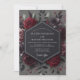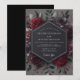 This design evokes a sense of moody, gothic romance. A stunning arrangement of deep claret red roses and dark, shadowy blossoms emerges from a charcoal background. Muted greenery and small berry accents add depth to the dramatic and elegant composition, perfect for a sophisticated affair.