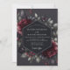 Embrace a dramatic and moody romance for your special day. This elegant design features a stunning arrangement of lush, painterly florals against a deep charcoal background. Rich claret peonies and dark anemones are artfully combined with muted green foliage and small crimson berries, creating a timeless, enchanting aesthetic.