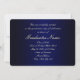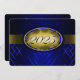 Convite à graduação de azul e ouro com listras azuis claras e escuras e uma fita de ouro passando mostrando o ano de graduação. A parte traseira do cartão é azul com fonte de ouro claro para as pessoas preencherem os anúncios de graduação.