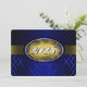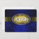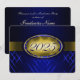 Convite à graduação de azul e ouro com listras azuis claras e escuras e uma fita de ouro passando mostrando o ano de graduação. A parte traseira do cartão é azul com fonte clara de ouro para as pessoas preencherem os convites de festa de formatura.