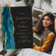 Este convite de festa de formatura de 2025 apresenta uma imagem de aquarela de um geode agado em tons de azul lacrimejo e turquesa com realces falhos de brilho dourado. A palavra "Graduação" e o primeiro nome do formando aparecem num elegante guião de escrita manual dourada sobre fundo preto, juntamente com os detalhes do partido em fontes sans serif e itálico. Substitua facilmente a imagem de amostra na parte traseira por uma foto vertical do formando.