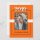 Este convite para a graduação em laranja e preto de 2019 pode ser personalizado para convidar para iniciar exercícios e/ou uma festa de formatura em honra do formando. Isso funcionaria bem para formandos masculinos ou femininos. A frente apresenta um retrato do estudante graduado colocado com destaque na 'classe de 2019' acima da fotografia e o nome do formando abaixo. Há também uma fita falsa sobre o meio atrás da foto. O verso contém todas as informações necessárias para comparecer às festividades. Uma linha preta e a "classe de 2019" estão na borda inferior. Este convite funcionaria bem para segundos graus e graduações de faculdade/universidade.