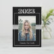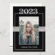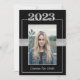 Este convite para a graduação da Classe Preta e Prata de 2023 pode ser personalizado para convidar para iniciar exercícios e/ou uma festa de formatura em honra do formando. Isso funcionaria bem para formandos masculinos ou femininos. A frente apresenta um retrato do estudante graduado colocado com destaque na 'classe de 2023' acima da fotografia e o nome do formando abaixo. Há também uma fita falsa sobre o meio atrás da foto. O verso contém todas as informações necessárias para comparecer às festividades. Uma linha preta e a "classe de 2023" estão na borda inferior. Este convite funcionaria bem para o segundo grau e graduação universitária.