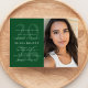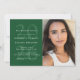 Para o seu segundo grau ou formando universitário, este cartão com fotos único pode ser usado como convite de festas, anúncio ou ambos! Com um ano atrás dos detalhes da festa, há espaço para os pais anunciarem seu formando, um nome de cheio e todos os detalhes da festa. As costas têm um padrão de listras brancas. A cor é verde por padrão, mas outras cores estão disponíveis na coleção de Lea Delaveris Design