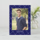 Este clássico, porém moderno, convite para a graduação apresenta um sofisticado design com um fundo azul marinho adornado com um padrão de diamante branco. A frente do convite mostra um modelo de foto personalizável, enquadrado pelo padrão do na moda. Abaixo da foto, o ano de graduação pode ser facilmente alterado para se adequar a qualquer classe graduada, seguida do nome personalizável do formando. A parte de trás deste convite contemporâneo continua o mesmo padrão de diamante azul e branco-marinho, com os detalhes do evento, como o nome do formando, data, hora, local e informações de contato RSVP apresentadas sobre um fundo azul sólido. O texto, tanto na frente como no verso, está misturado com cinzas ou prata e branco, proporcionando um aspecto limpo e moderno. Basta clicar em "Personalizar este modelo" para alterar ou remover facilmente qualquer texto de exemplo. Esse convite é perfeito para formandos que procuram anunciar sua conquista de forma elegante e personalizada. O modelo personalizável permite uma personalização fácil, fazer adequado para qualquer celebração de formando. O seu design minimalista, mas clássico, faz dele uma escolha versátil para formandos masculinos e femininos, garantindo um eterno e um anúncio elegante.