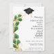 Esses convites de formatura elegantes apresentam um texto modelo para personalizá-los facilmente. Ilustrações únicas de eucalipto verde esmeraldo e ouro e um boné de formando decoram os convites. O modelo de foto está no verso.
