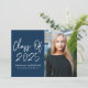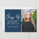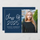 A festa de formatura moderna convida com "Classe de 2025" em um script manuscrito branco em fundo de marinho. Personalize a parte frontal do convite de formatura, adicionando o nome do formando, o nome da escola e a foto vertical. O convite reverte para exibir os detalhes da sua festa de formatura em letras brancas em um plano de fundo de marinho.