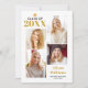 Classe de boné de formatura branco e ouro 2025. Mostra nossas fotos, seu texto em ouro sobre fundo branco e um boné de formatura. A parte traseira inclui os detalhes da parte em um quadro com uma borda padrão feita de bonés de formatura.