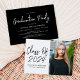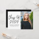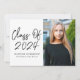 A festa de formatura moderna convida com "Classe de 2023" em um script manuscrito preto em um fundo branco. Personalize a parte frontal do convite de formatura, adicionando o nome do formando, o nome da escola e a foto vertical. O convite reverte para exibir seus detalhes de festa de formatura em letras brancas em um plano de fundo preto.