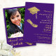 Criar um convite único para a graduação em fotografia para a classe de formandos 2025, desenhada em cores roxas e douradas decoradas com ilustrações de boné e diploma. Os modelos facilitam a personalização dos convites com seus dados e o upload de uma foto no verso.