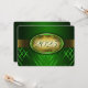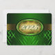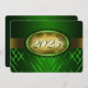 Convite à graduação verde e dourado com listras verdes claras e escuras e uma fita de ouro passando mostrando o ano de graduação. A parte traseira do cartão é verde com fonte de ouro claro para as pessoas preencherem os anúncios de graduação.