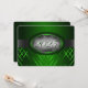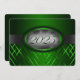 Convite à graduação verde e prateada com listras verdes claras e escuras e uma fita prateada passando mostrando o ano de graduação. A parte traseira do cartão é verde com fonte prateada clara para as pessoas preencherem os anúncios de graduação.