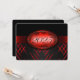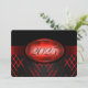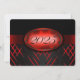 Convite à festa de formatura vermelha e preta com listras vermelhas claras e escuras e uma fita vermelha passando mostrando o ano de graduação. A parte traseira da placa é preta com fonte vermelha clara para as pessoas preencherem os convites de festa de formatura.