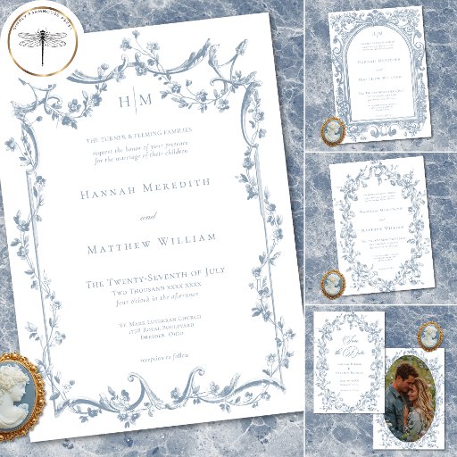 Announce your special day with an elegant traditional wedding invitation featuring a delicate, vintage-style border of florals in soft dusty blue. Perfect for a formal ceremony or an affair with a classic, timeless aesthetic. This refined design offers an opulent look. Created by Simply Farmhouse Press.