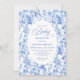 Create a timeless first impression with this baby shower invitation featuring elegant French toile de jouy roses in refined shades of navy blue, royal blue, dusty blue, and deep blue, inspired by classic chinoiserie floral design. This sophisticated style blends heritage elegance with modern charm, making it perfect for a memorable baby shower celebration.