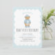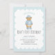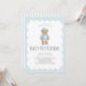 This design features a preppy bear birthday themed "Bear'y First Birthday" with a cute teddy bear in pastel blue baby outfit, scalloped borders and striped blue and white backside. Perfect for a baby boy's first birthday party. This product can be easily personalized.