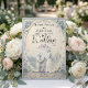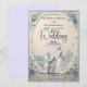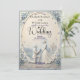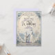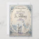 Set a sophisticated tone with this dusty blue and cream design, featuring a printed faux bas-relief proposal scene perfect for a springtime celebration.This elegant composition utilizes a formal typographical hierarchy, balancing classic serif fonts in dark navy with flowing calligraphy script. The central illustration showcases a highly detailed, faux 3D sculpted aesthetic depicting a classic garden environment. Visual elements include an off-white and cream background framing a cobblestone path, a traditional pavilion building, and a kneeling groom proposing to a bride in a flowing dress. The perimeter is softened by an oval botanical border of dusty blue blossoms, soft grey-blue greenery, and scattered flower petals.This is a flat printed image with a faux bas-relief effect, not actual raised material.