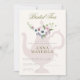 Um elegante pote de chá, desenhado à mão, assim como uma coroa floral de aquarelas com anêmonas e outros verdes, decoram este elegante convite de festas de chá de noiva com tema floral que também apresenta caligrafia moderna. Luxuoso, mas simples, clássico, mas chique, moderno, mas eterno.