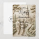 Evoke the grandeur of history with this faux bas-relief design featuring a classical romantic scene in monochromatic stone tones, perfect for formal cathedral ceremonies.This design utilizes a trompe-l'œil technique to simulate the appearance of a hand-carved limestone or plaster frieze. The composition leads the eye down a winding cobblestone path where a bride and groom, depicted in Grecian-draped silhouettes, walk toward a Gothic cathedral spire nestled among cypress trees and blooming rose bushes. The color palette is strictly monochromatic, utilizing shades of warm ivory, beige, and cool stone gray to enhance the depth of the digital shadows and highlights. The typography hierarchy balances elegant black calligraphy for names with traditional Roman serifs for the venue details, maintaining an organized, art-history-inspired layout.