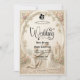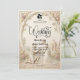Transport guests to a romantic bygone era with this Regency-inspired engagement design, featuring a faux stone bas-relief effect and soft pastel florals.This design features a sophisticated trompe-l'œil (optical illusion) composition simulating the look of an antique stone carving. The visual center captures a silhouette of a couple in a traditional kneeling proposal pose, framed by an intricate archway of faux sculpted masonry. The "stone" features a warm, neutral cream and beige palette, accented by printed textures of pastel pink roses and sage green climbing vines that appear to grow over the arch. The typography hierarchy balances a bold Gothic blackletter font for the couple's names with a whimsical, flowing calligraphy script for the event details, set against a background of a distant gazebo temple and cobblestone path.