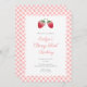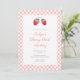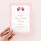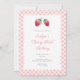 Estes Convites de festas de aniversários Berry Sweet First contêm as minhas ilustrações originais sobre morangos. O impressão cor-de-rosa e branco foi criado digitalmente por mim.