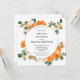 O chá de panela apresenta uma elegante e uma dica de designs de vassoura com flores laranja e flores brancas equipadas com clementinas. O texto "Ela encontrou seu aperto principal" no topo e outros detalhes podem ser personalizados.