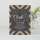 Clink do Fizz do pop. O convite de festas festivo de ano novo que caracteriza um teste padrão corajoso do brilho do ouro. Note por favor, o brilho é falso e será imprimido horizontalmente.