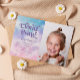 Cartão de convite de aniversário Dreamy com ilustração aquosa do céu rosa, azul e rosa com estrelas e nuvens. O texto diz "Estamos na Nuvem Nove." Perfeito para o 9º aniversário da sua garota. Adicione a foto do seu filho neste convite.
