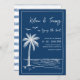 Announce your seaside "tying the knot" celebration with this Coastal Blues Palm Tree Wedding Invitation. The design features a deep navy background with crisp white lettering and a hand-drawn sketch of a palm tree on the beach, gentle ocean waves, and delicate seashell accents. A rustic, hand-painted navy and white striped back adds a relaxed coastal touch, perfectly balancing casual charm with elegant beach style. Modern handwritten script headings and informal wording create an inviting, laid-back feel—ideal for couples tying the knot at a destination, coastal, or oceanfront wedding. Personalize with your details for a beautifully coordinated introduction to your special day.