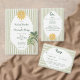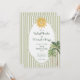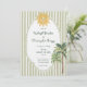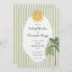 This whimsical coastal wedding invitation features a vintage sun motif, lace border, palm tree, and stylish sage green stripe background. Perfect for a beach or California destination wedding. Created by Simply Farmhouse Press.
