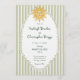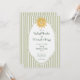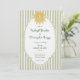 This whimsical coastal wedding invitation features a vintage sun motif, lace border, palm trees, and stylish sage green stripe background. Perfect for a beach or California destination wedding. Created by Simply Farmhouse Press.