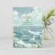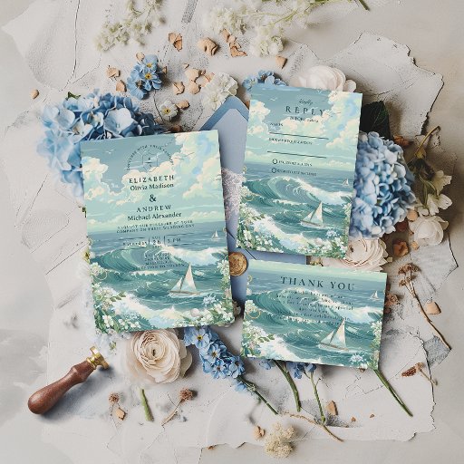 This coastal wedding design features a serene ocean scene with rolling teal waves, a graceful sailboat, and an open sky filled with soft clouds and seabirds. The hand-illustrated watercolor style creates a light, airy atmosphere that feels calm, romantic, and timeless.