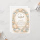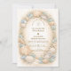A refined coastal wedding design featuring an elegant oval wreath of seashells, oyster shells, starfish, and soft sea glass accents. Neutral sandy tones blend with muted ocean blues and delicate dune grasses to create a serene seaside aesthetic. The warm parchment background enhances the natural textures while maintaining a timeless, elevated feel. Perfect for a romantic beach celebration with classic coastal charm.