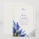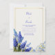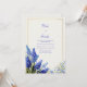 This timeless botanical design features clusters of vibrant cobalt and sky blue muscari—popularly known as grape hyacinth—paired with delicate blue wildflowers and slender green stems. The arrangement is anchored by a sophisticated double-line gold rectangular border, set against a subtle, cream-colored textured background that mimics fine artist paper. Every petal is rendered with deep color and precision, offering a classic yet fresh garden aesthetic that brings an air of elegance to your special day. This elegant botanical layout is perfect for a classic spring wedding or a traditional garden ceremony. The rich cobalt and sky blue tones make it a stunning choice for coastal or lakeside celebrations, beautifully echoing the hues of the water. It is also ideal for a sophisticated bridal luncheon, a formal engagement announcement, or an upscale rehearsal dinner. This design complements color palettes featuring navy blue, metallic gold, sage green, or warm ivory, fitting seamlessly with traditional romantic or modern botanical aesthetics.
