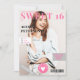 um cobrir de revista divertido Convite para festas de aniversário Sweet 16 , com duas fotos, e ousado tipo rosa e cinza, aqui está a colher, o vamos comemora a aniversariante.