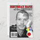 Ponha seu rosto no cobrir de uma revista para sua próxima Festa de aniversário! Diversão, qualquer idade, manchete vermelho e cinza, design da revista festa de aniversário com balões coloridos onde você pode adicionar sua idade e personalizar com seu nome e detalhes da festa. Concluído com um código de bar RSVP! Apenas troque a foto da amostra por sua. Foto de exemplo cortesia de George Hodan em publicdomainimages.net.