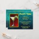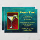 Convite de festas genérico. Desenho de um vidro martini num esboço preto espesso, colorido em verde limão e amarelo. Um limão fatiado repousa na borda do vidro. Cercado por uma dupla borda de amarelo e verde limão. O fundo da ilustração é um estilo verde claro e vermelho escuro. O fundo do convite é uma textura vítrea verde fosco.