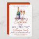 Um convite de festas coquetel. Design de uma garrafa de champanhe, vinho espumante e 2 copos de flauta. Um design de celebração encantador com laranja queimado e texto roxo convidando seus convidados para uma festa de natal festiva. Fácil de personalizar com os detalhes do seu próprio partido.