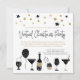 Convide seus amigos para uma festa virtual online de Natal para quando não for possível se reunir pessoalmente. Este é um design de tendência em preto e ouro com motivos de coquetéis, balões, bolos e champanhe correndo ao longo do fundo e estrelas de arte e círculos no topo. O cabeçalho principal está em uma tipografia de script informal definida em preto, e o resto do texto que você pode personalizar facilmente para seus próprios detalhes. Você também pode alterar as cores de fundo branco e dourado em cada lado se desejar por meio da opção personalizar mais.
